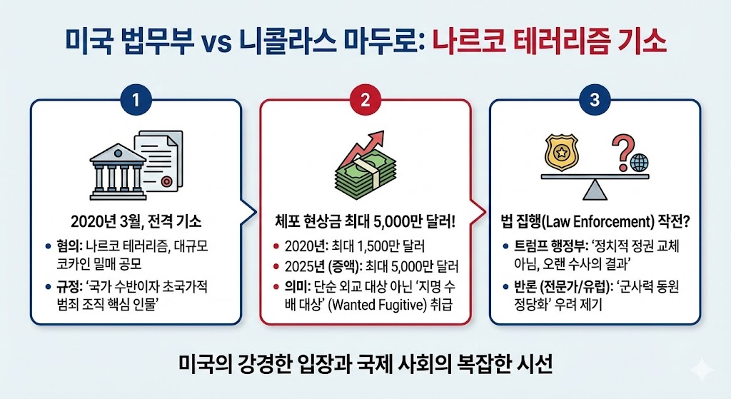 미국 법무부는 2020년 3월, 베네수엘라 대통령 니콜라스 마두로를 ‘나르코 테러리즘(narco-terrorism)’ 및 대규모 코카인 밀매 공모 혐의로 전격 기소했다. 당시 미국 정부는 마두로를 “국가 수반이자 동시에 초국가적 범죄 조직의 핵심 인물”로 규정하며, 체포에 결정적 정보를 제공할 경우 최대 1,500만 달러의 현상금을 제시했다.