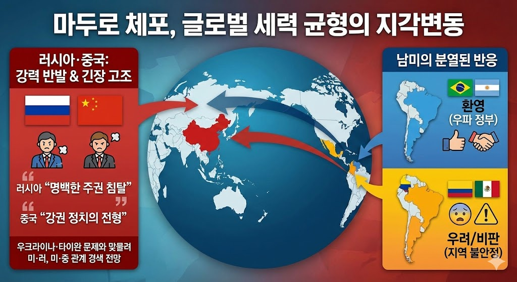 - 남미의 분열: 브라질, 아르헨티나 등 우파 정부는 환영의 뜻을 내비치는 반면, 콜롬비아와 멕시코 등은 지역적 불안정을 우려하며 신중하거나 비판적인 태도를 보이고 있다.