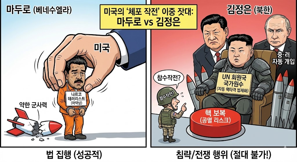 트럼프 행정부의 ‘마두로 생포’는 독재자들에게 강력한 심리적 압박을 주었지만, 이를 북한에 그대로 대입하기에는 핵(Nuclear)과 동맹(China/Russia)이라는 두 가지 거대한 벽이 존재한다.