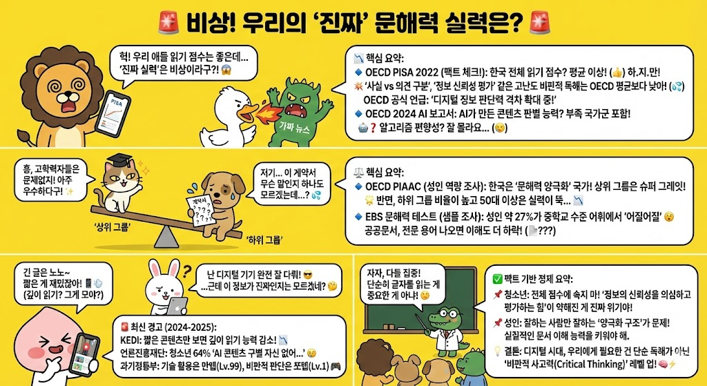 - 청소년 디지털 문해력의 몰락: OECD PISA 결과는 더욱 충격적이다. 사실과 의견을 식별하는 우리 청소년들의 역량은 25.6%에 불과해, 영국(68%)이나 미국(65%) 등 주요 선진국은 물론 OECD 평균(47%)에 한참 못 미치는 최하위권 수준을 기록했다.