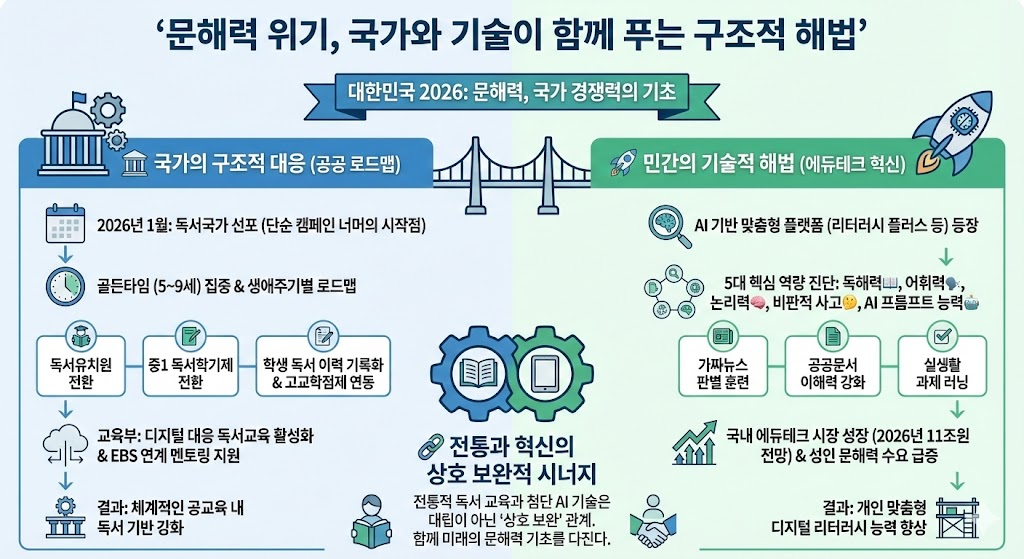 민간 영역에서도 이 흐름에 기술적 해법을 제시하려는 움직임이 활발하다. 가짜뉴스 판별 훈련, 공공문서 이해력, 실생활 과제 러닝 등 디지털 리터러시 영역까지 포괄하는 이러한 시도는, 전통적 독서 교육과 AI 기술이 대립항이 아니라 상호 보완적 관계에 있음을 보여준다. 국내 에듀테크 시장이 2026년 약 11조 원 규모로 성장하고, 특히 성인 대상 자기계발 및 문해력 교육 수요가 급증하고 있다는 점은 이 분야의 사업적 가능성도 뒷받침한다.