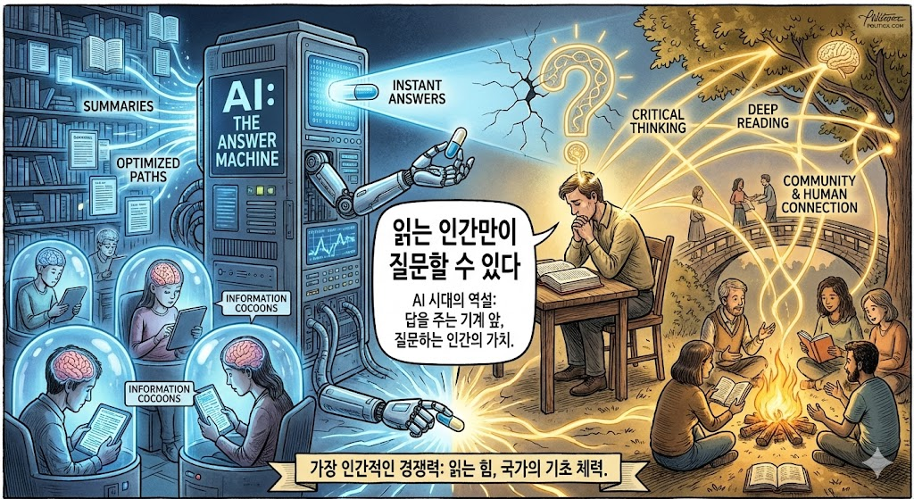 PIAAC 결과에서 확인된 한국 성인의 문해력 하락, PISA가 보여주는 청소년의 디지털 문해력 취약성, 인지적 오프로딩 연구가 경고하는 AI 의존의 인지적 대가, 그리고 가짜뉴스와 AI 생성 콘텐츠가 범람하는 정보 환경. 이 모든 것이 하나의 메시지로 집약된다. 읽는 힘은 이제 개인의 교양이 아니라 국가의 기초 체력이며, AI 시대를 관통하는 가장 인간적인 경쟁력이다. 책장을 넘기는 소리가 곧 미래를 여는 소리라는 말이, 지금처럼 절실하게 들리는 시대는 없었다.