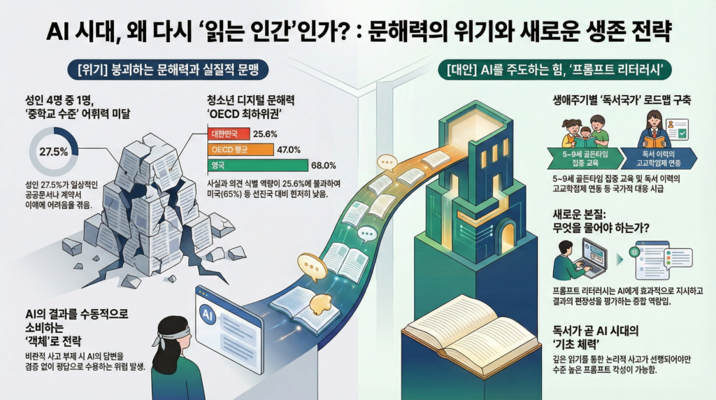 2026년 2월, YTN이 보도한 ‘AI에 빼앗긴 문해력’ 영상이 온라인에서 빠르게 확산되었다. AI의 답변을 검증 대상이 아닌 ‘정답’으로 받아들이는 학생들이 늘고 있다는 내용이었다. 불과 한 달 전인 1월 23일에는 국회에서 ‘독서국가’ 선포식이 열렸고, 범정부 차원의 독서국가 추진위원회가 출범했다. “읽는 인간만이 AI를 주도한다”는 이날의 슬로건은, 생성형 AI가 2년도 안 되어 전 세계 시스템을 송두리째 바꾸고 있는 이 시점에서 역설적으로 가장 아날로그적인 행위가 국가 생존 전략의 핵심으로 격상되었음을 선언한 것이다. 이 두 장면 사이에, AI 시대 문해력이라는 거대한 화두의 본질이 담겨 있다.